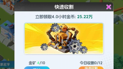 当然,金币收集器的功能并不仅有这一些,它还提供了快速收割功能,玩家们缺金币时可使用该功能快速获得一段周期内的金币产量,周期时长会随金币收集器的等级增长而增加,当金币收集器达到等级上限(30级)时,可一次性收割5小时的周期金币产量,且这种收割模式并不会影响金矿的金币产出效果,属于额外让玩家们获得更多金币。每天能进行收割的次数有限,最高为12次,且前2次可免费收割,之后若还想继续收割,则需要消耗宝钻。