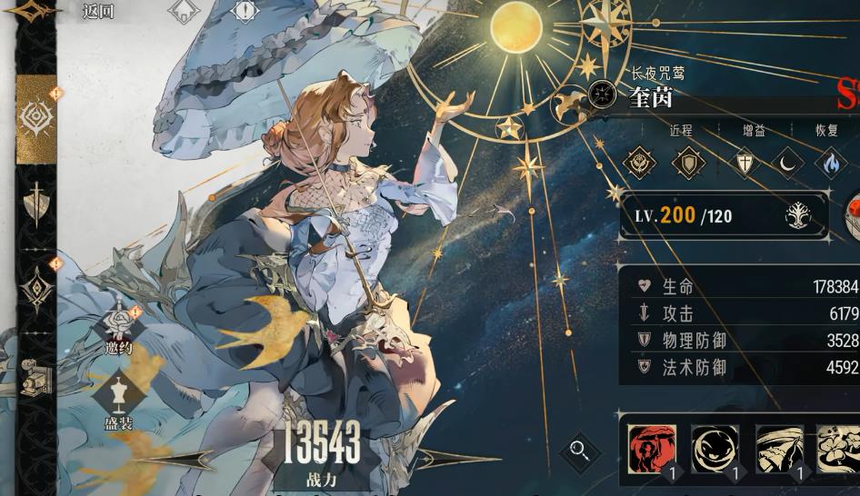 奎茵的普攻名为执伞,效果较为简单,单体近战法术伤害倍率一般。在队伍输出练度足够的情况下,无需依赖前排守护者承担输出职责,因此她的普攻更多作为基础攻击手段,而非核心输出来源。战技名为伞荫圆舞,为在战斗开场触发的全队免死,0.5秒的无敌窗口期能够为治疗角色创造拯救残血队友的时间,强化对后排单位的保护。尤其是在竞技场对战终焉的苍凛开大后,待其释放奥义后免死效果,可与自身奥义的群体减伤进行伤害平摊。