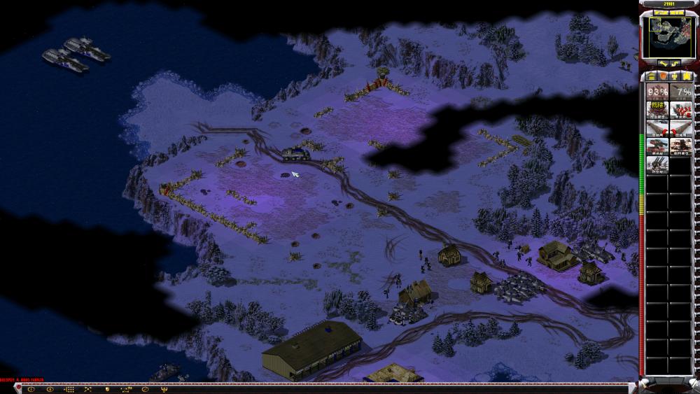 注意,直接打基地车你是不会赢的,但是电脑不会发展,也就是说你就只需要对付地图上的这些部队即可,在消灭了他们后,你可以把围墙卖掉,让盟军去发展吧,不过这回他的基地将兵临城下。等到战车场一造好,打掉即可。