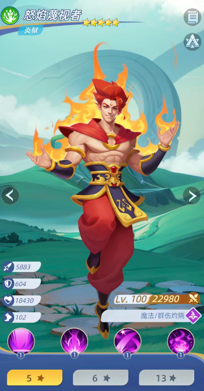 为强化灼烧覆盖率与元素协同性,推荐搭配火系法师怒焰蔑视者(炎狱)。其技能可对敌方前中排目标造成156%魔法伤害,并附带30%概率施加【灼烧】;普攻亦有30%概率触发该状态。与尚绮形成物理+魔法双轨灼烧路径,显著缩短叠层周期,确保5层灼烧在2–3回合内稳定成型。二者配合,不仅提升整体DOT覆盖率,更实现伤害类型的互补压制,有效应对不同抗性配置的对手。