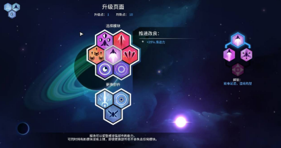 飞船系统由四大可替换部件构成:机体、武器、护盾、推进器,每类均含数十种功能迥异的实体模块。例如武器模块涵盖激光阵列、离子鱼雷发射器、脉冲加农炮等;护盾模块支持偏转型、吸收型、再生型三类逻辑;所有模块升级均依赖局内获取的“进化点数”,通过消耗点数解锁并强化对应属性。界面中蓝色进度条代表护盾值,红色进度条代表机体耐久,二者独立运算、分层承伤——护盾耗尽后机体直接暴露于攻击之下,一旦机体归零即判定本局失败。