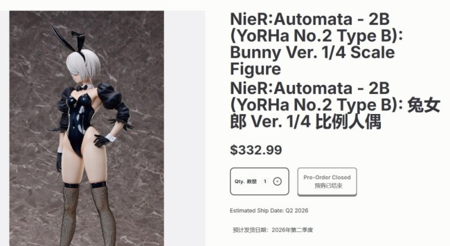 良笑社(Good Smile Company)于今日推出以《尼尔:自动人形 Ver1.1a》动画形象为基础的2B(寄叶二号B型)兔女郎版本1/4比例手办,售价333美元。