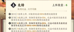 玩家在进行派别区分的时候,如果先锋武将占据多数的话,就可以顺利成行的提升其队伍的防御性作用。选择武将也是有一定说法的,可以选择新手友好型的即可!比如典韦,姜维,魏延,文丑以及关平都是可以的,这样的搭配方式就可以成功激活穿刺效果了!
