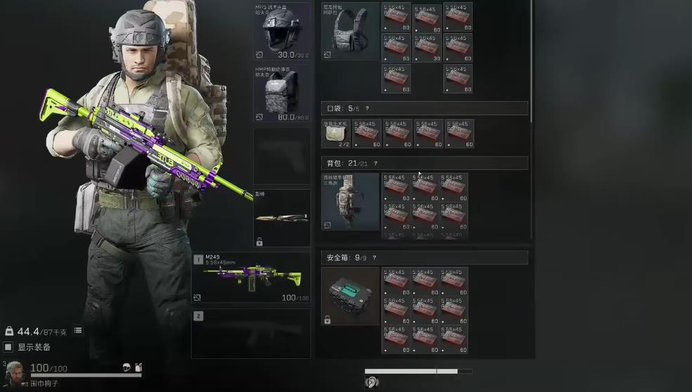 背包是用来放入搜索到的物品,容量越大就意味着可带走的物资越多。而最大的高价值红色收集品体积是3×4的12格,因此选择背包的最低标准是12格容量,否则会面临看到高价值收集品却装不下的尴尬情况。在战斗中从敌人身上缴获的武器价值较高,部分可达50万左右,远高于收集来的普通蓝、紫色物品。因此背包需要能容纳该类武器,而大多数武器体积为2×5、2×4,还有特殊武器如M250机枪体积为2×6格。
