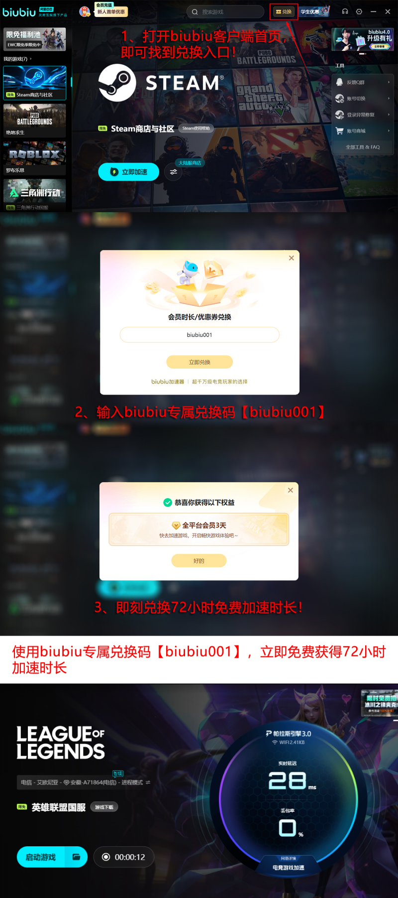 biubiu加速器技术积累深厚,已通过职业电竞场景验证——曾获PUBG职业选手小叮当公开推荐。其搭载自研帕拉斯3.0网络加速引擎,支持毫秒级动态路径探测与实时流量调度,能精准识别并绕行高丢包、高延迟中间节点。当前新用户可凭通用兑换码【biubiu001】领取3天免费加速时长;首登用户另享24小时专属礼包,叠加使用总计可达96小时免付费体验。