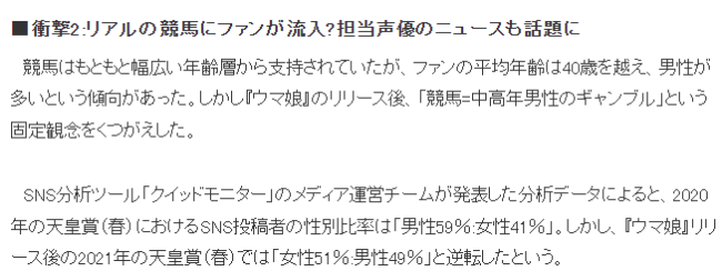 根据协会的统计,喜欢赛马的人士年龄层偏高,在40岁以上,而且男性居多,然而游戏发售后大批年轻人疯狂涌入真实赛马界,不但女性马友首次超过男性比例,就连游戏的声优也参与赛马竞猜甚至中了奖。