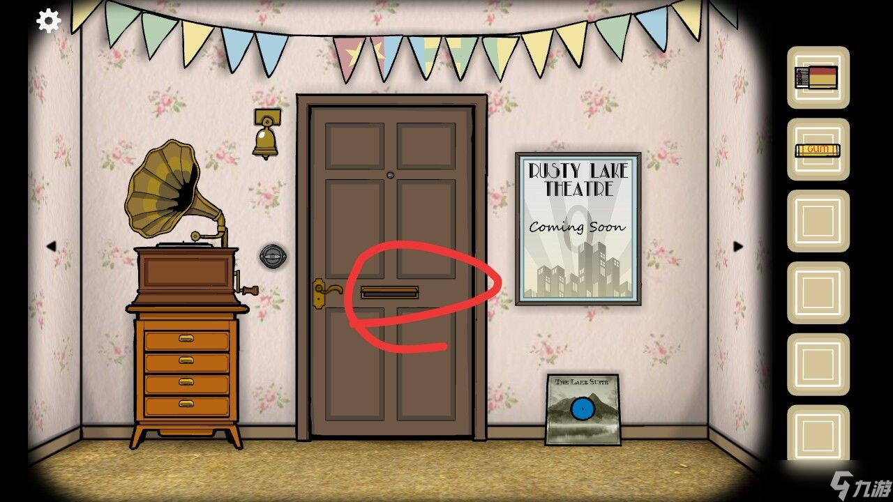 3、在门口旁的海报上玩类似俄罗斯方块的游戏,完成后会掉下一个唱片