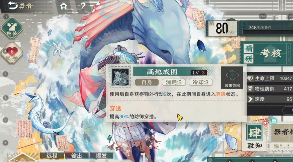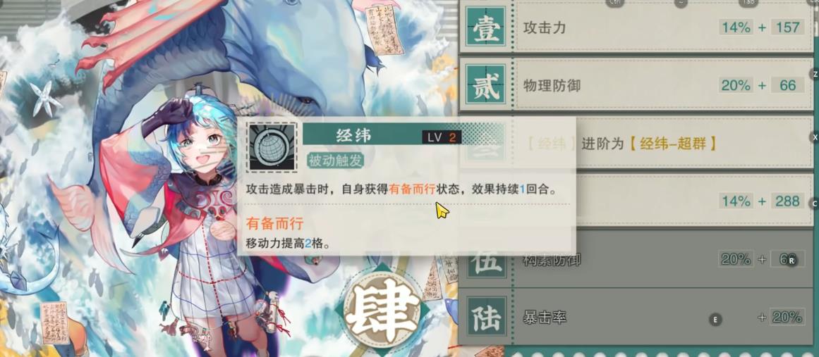 作为爆发角色还是需要尽量打半血以上的敌方,触发游历状态,这是万国全图主要的爆发手段。因为该技能的存在,她的装备都不需要选取暴击,对词条要求较低。被动二两级是暴击后自身会获得有备而行状态,提高自身的移动力,三级就是提高三格移动力,六致知时基本可以做到稳定暴击,因此有备而行的状态可视为常驻能力,而瞄准冷却对于其意义就不算大了。