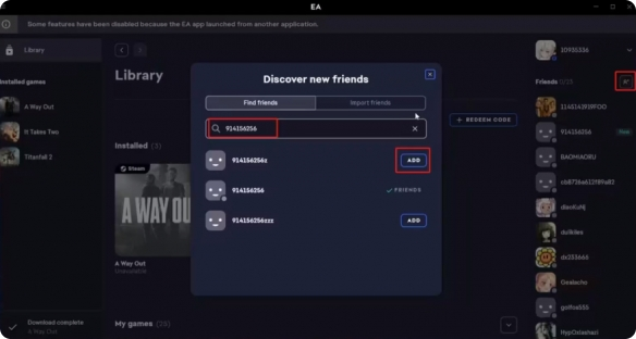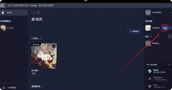 1、两名玩家都需要在EA中绑定Steam,登录EA平台,在右下角点击导入Steam好友。