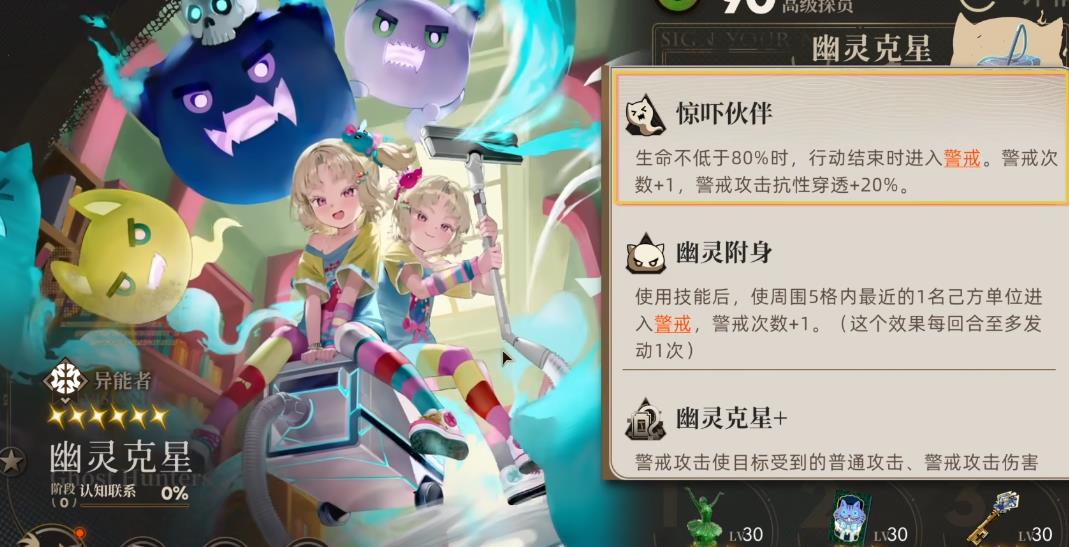 天生特性名为惊吓伙伴,让幽灵克星在生命值大于等于80%时,结束行动并进入紧急状态,该特性同时会赋予其一次警戒次数,并在警戒攻击时无视目标20%抗性。特性二名为幽灵附体,让她在行动后可使周围五格内最近的友方单位进入紧急状态,并获得一次警戒次数,可配合不容易进入紧急状态的警戒角色,也可以搭配心锚技能为不具备竞技能力的突击狙击角色回能。