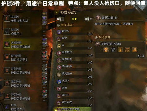 感觉各方面都比较满足我强迫症,作为拔刀套没有多余的会心技能浪费,作为奶套,配套小技能拉满。之前有想过输出技能为逆袭挑5打底,想开发无伤,怨恨,锁刺。但是还是无法兼得,索性把无伤怨恨全下了把奶拉满。暗黑的话,套装基本都带怨恨,和会心系技能,怨恨前面考虑和无伤无法拉满,就把暗黑去了。这样也好,战斗时放空大脑,一蓄三蓄力随便打,不用经常考虑三蓄触发暗黑,有机会就砍一刀滚就完事了。也不用考虑红血,满足感广域化随便吃药,顺便奶队友。反正联机,随性,放空大脑,舒适着打就完了。