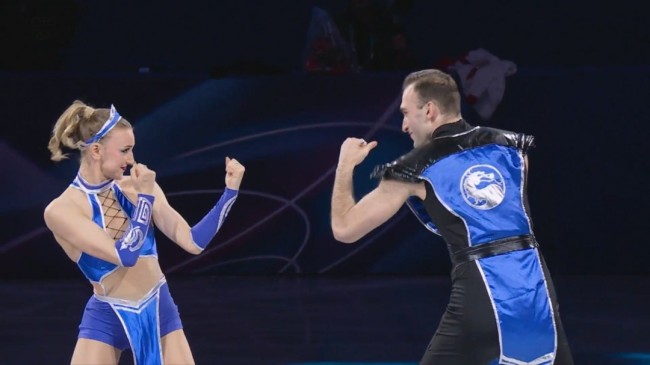 在比赛中,他们换上各自的《真人快打》主题服装:贝鲁拉瓦扮成忍者绝对零度,梅特尔金娜则扮成吉塔娜,复刻了大量游戏经典名场面。他们伴着主题曲《Techno Syndrome》翩翩起舞。表演中穿插着各种招式、招牌动作以及被打得晕头转向的华丽打斗。