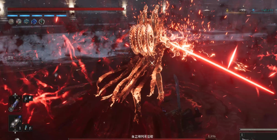模块二是用刀攻击两次后回退,模块三是先用镰刀攻击后回退同时还会勾一刀,四是进行三连击后回退,五是砍一刀后同时举起两把刀攻击一下,六是用双刀发动不规则五连击,模块七是血艺师跳劈过来发动不规则八连击。第一阶段需要注意的有两点,一是距离血艺师较远时它会先用钩锁技能,拉近距离后再发动其它招式,二是玩家吃药可能会触发血艺师的药减,此时它眼睛会发出红光并零帧起手直接进行攻击。