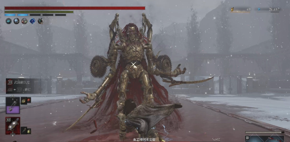 血艺师的第一个招式是直接过来戳一刀,然后举起镰刀攻击两下,最后会将镰刀和刀同时举起砸向玩家,可以按节奏进行四个格挡来应对。招式二是血艺师先用镰刀攻击,随后举刀再次攻击,最后用镰刀和刀横扫两下,应对方式跟第一个招式一样。招式三是先用刀撩击一下,接着在身后转刀并向下劈砍,之后还会用镰刀和刀进行两次横扫。