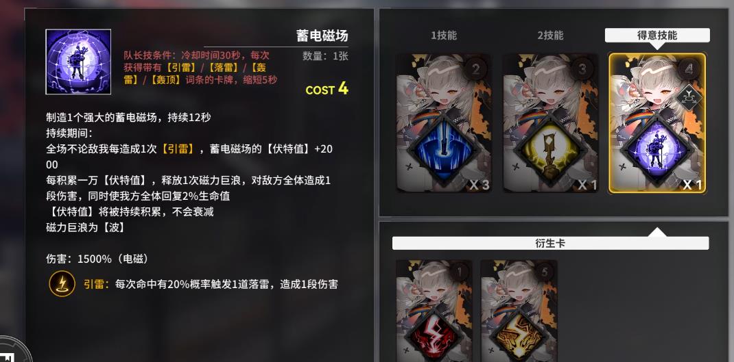 二技能名为磁力饵,为三费的黄卡,在使用下一张带引雷的红卡或者橙卡后,会从牌库和弃牌区将三张带有引雷词条的卡牌加入手牌,令下一张引雷词条的红橙卡伤害提高。从牌效而言,三费获得三张卡其实性价比很高,但是缺点在于需要满足触发条件,必须要打出引雷的红橙卡才能起作用。