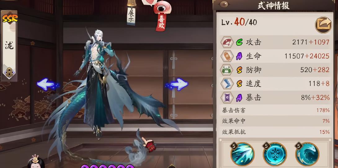 泷是稀有度为SSR的道馆与斗技式神,不打的话完全可以不养。技能的要求较为简单,满二技能与三技能就行,需要八至十二个黑蛋左右就行。在御魂方面最为重要的属性是防御值与生命,特别是在道馆防守队伍里需要保证生命、防御均在800以上。四件套推荐选择地藏,同时要堆到40%暴击,速度需要控制在128以下。在道馆进攻队伍里则通常搭配双拉体系,因此采用散件即可,重点堆防御并达到速度超越阴阳师的状态,配置相对简单。