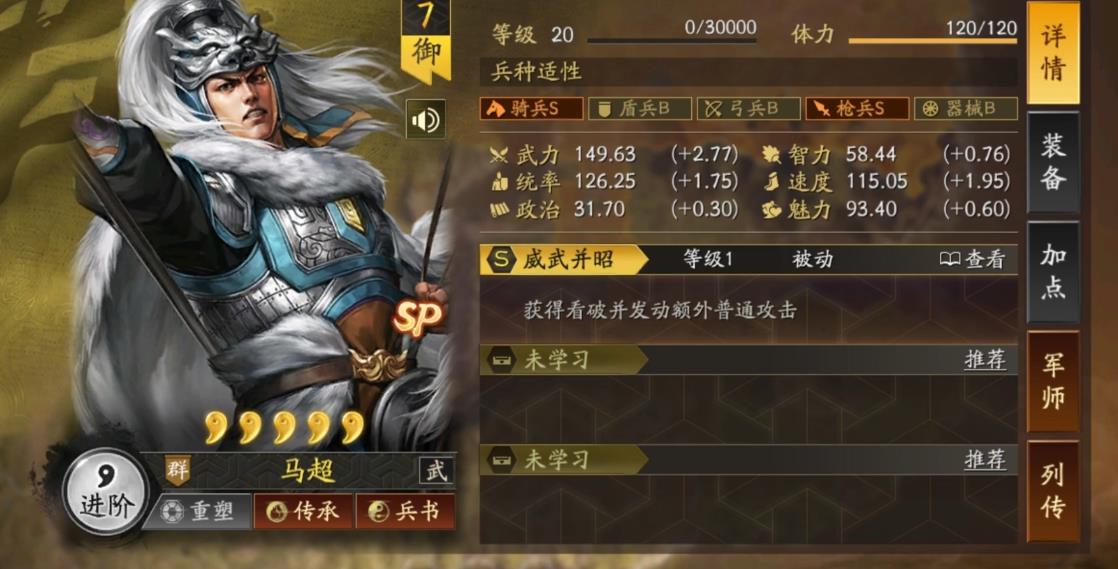皇马枪是以SP马超为核心所构筑的单核阵容,其中皇甫嵩为辅助,许攸打控制。而SP马超的强势处在于具有减伤效果的看破机制,但并不是所有的战法与机制都能看破,例如荀彧的警戒与城建的九宫图、八卦阵等。该武将每回合最多打四次的普攻,自带战法的普攻不受混乱影响,但是会被缴械和震慑影响。在战区内缴械类队伍不多的前提下,优先为SP马超选择当锋摧决加速乘的战法组合。