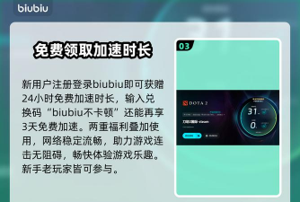 新用户注册后可立即启用24小时全功能免费加速服务,无需绑定支付方式。完成首次登录并验证设备后,输入激活码【biubiu不卡顿】,即可额外获得72小时加速时长,总计享受96小时无限制Dota2专项优化。该试用机制覆盖Steam国服、国际服及第三方平台启动器,兼容Windows 10/11操作系统及主流显卡驱动环境。