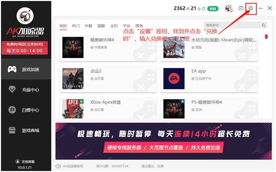 下载并打开AK加速器,点击右上角【设置】按钮,在【兑换码】里输入口令:不上班,即可免费获得48小时超值时长。PC端移动端都可以用,既支持端游加速、也支持手游加速。