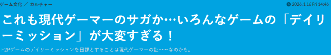 free-to-play(F2P)是当下网络游戏领域的主流商业模式,简而言之基本免费游戏,日前有一位日本玩家吐槽自己每天都得习惯性l做好几个游戏的日常任务,引发热议,玩家纷纷表示强迫症惹不起。