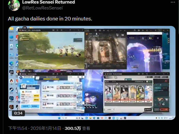 LowRes Sensei Returned玩家发推,吐槽自己的“强迫症”,目前正在玩的好几个F2P游戏,疯狂的同时切换多个页端游戏做日常任务,熟练的操作也花了20分钟。