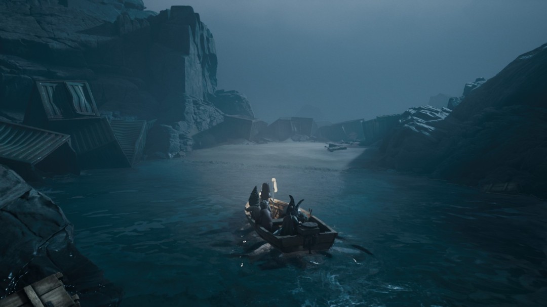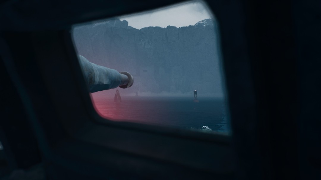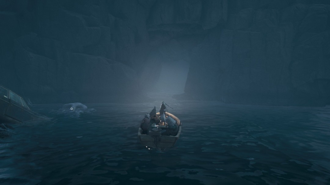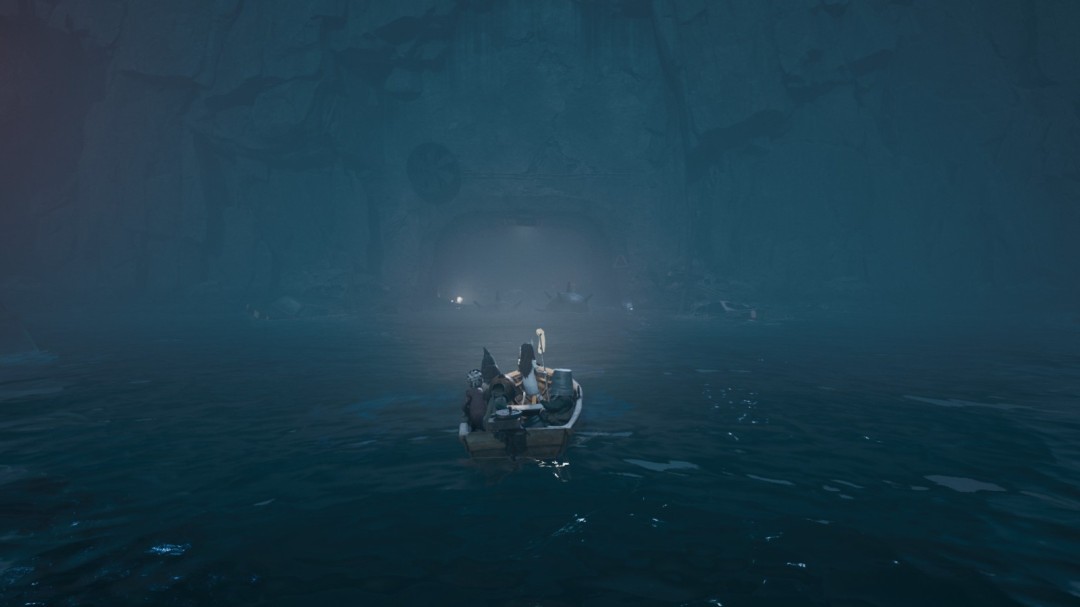 推进主线会来到一处隧道,门口有两个鱼雷。先不要进隧道,右手边有一处岔路洞穴,开船进入到底上岸