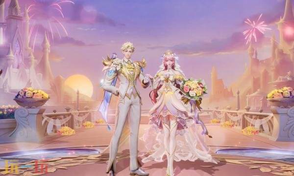 【大乔-沐霞之诺星传说】设计以玫瑰与晚霞交织为灵感,以粉紫融合浅金的黄昏色调,勾勒出宛若被霞光祝福的浪漫婚礼意象。