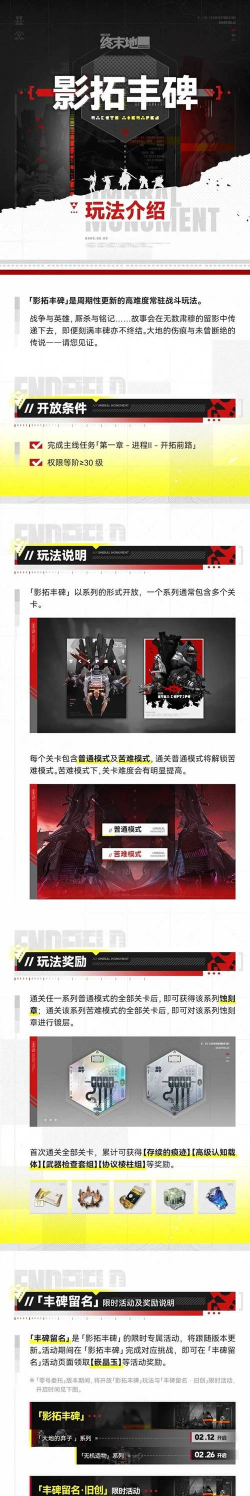 “丰碑留名”为影拓丰碑配套限时活动,随游戏大版本同步更新。活动期间,玩家在影拓丰碑中完成指定挑战目标,即可前往活动页面领取嵌晶玉等奖励。在“零号委托”版本周期内,“影拓丰碑”玩法正式开放,同步开启“丰碑留名·旧创”限时活动。活动期内,仅需通关任意普通模式关卡,即可领取全部嵌晶玉奖励。