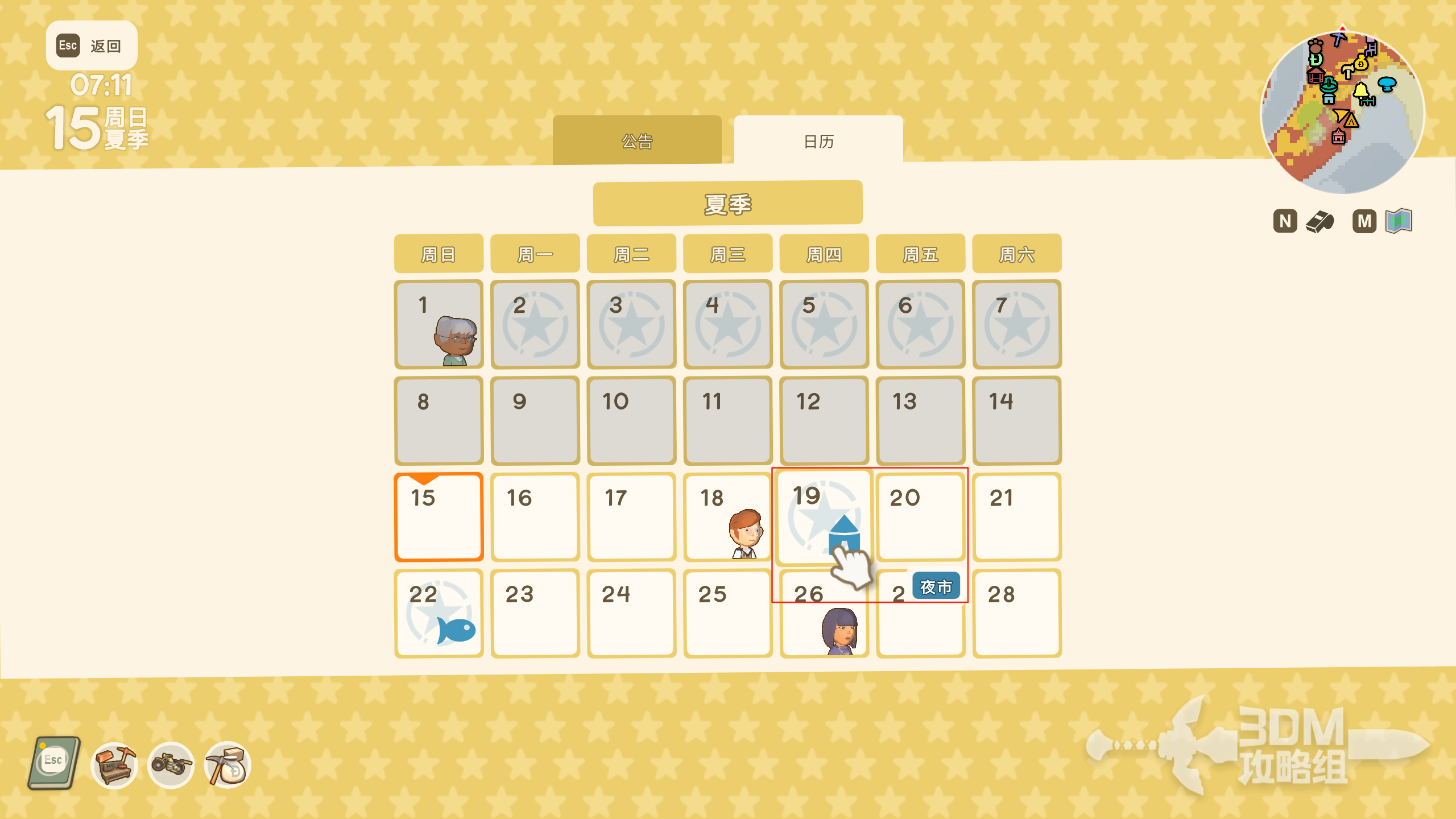 首先要建造【约翰好物】商店、博物馆以及游客帐篷。成功建造后,可以在告示板的日历处看到夜市的活动。