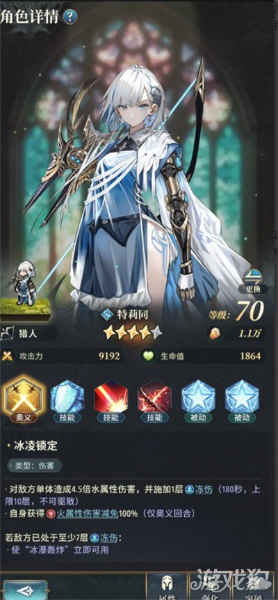 游戏内冻伤流派的主要C位,是”特莉同,她拥有专属的冰冻水系技能,能够释放”冰凌锁定”,对敌方单体目标,造成450%的水属性伤害,同时为敌人附加一层冻伤buff,该buff的维系时间是180S,最高上限是十层,并且是不可驱散的buff,释放技能后,还能使得自身获取一层火属性完全免疫的buff。