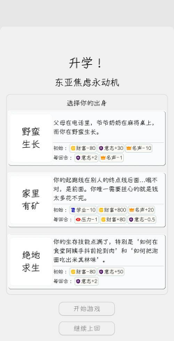 都是简约的画面来制作,适合喜欢观看文字的玩家们,在游戏开始的时候选择自己的出身,出身的选择决定着大家后期奋斗的途径,设计了三种身份,都有初始的数值,大家需要根据不同的数值来奋斗增加,后期在每一个回合当中,都要使用卡牌,也有产出的效果和结果,随着故事的发展,游戏中也提供了升学的志愿,可以自愿的选择托管所或者是艺术的幼儿园,像这种幼儿园的升学要求是比较高的。