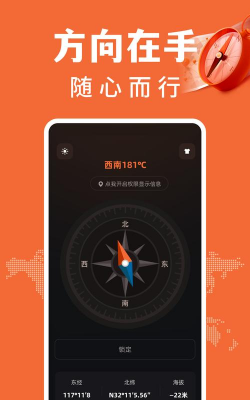 通过名称就可以看出这是一款在旅途过程中可以带来很多帮助的工具。有GPS定位的优势,能够帮助大家随时知道自己的方位、精度、纬度和磁场强度等数据显示,根据箭头方向就可以轻松搞定东西南北,360度都没有死角。