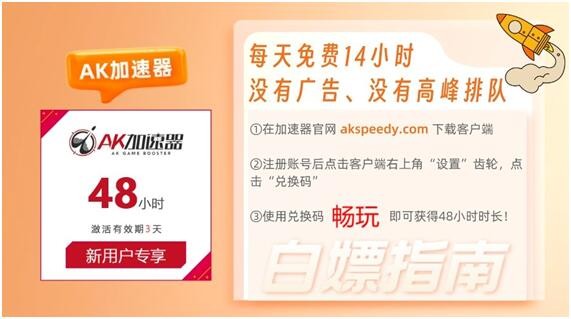 玩网络联机游戏,就用AK加速器,高效加速、价格实惠,每天00:00-14:00更是定时免费,简直就是游戏加速器里的免费加速器。AK加速器口令兑换:畅玩,免费领取48小时时长