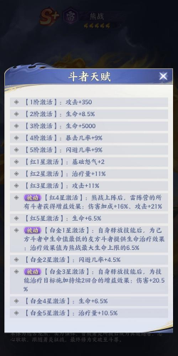 其实,针对天赋系统,往往会让熊战的团队价值变得更高,其实对于玩家来说,当他激活一到五阶的属性加成之后,他的攻击值,生命、暴击等等都将会有效的提升。随着他的等级得到提升,玩家如果更好的去培养熊战的话,大家就会发现熊战在战斗的时候,他所代表的阵营伤害加成将会得到提升,所以说在整个战斗的过程当中,熊战作为雷系辅助的核心所在,它其实也具备坦克跟输出的状态,所以玩家在阵容搭配方面的话,尽量给他搭配雷系的队伍。
