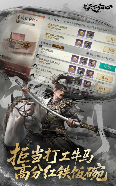 玩家在看到三国天下归心的游戏时会发现该款游戏的口号就是反内卷、不种田,为了将这个口号给贯穿到底,该游戏更是提供了相匹配的详细玩法,玩家在游戏中不用打地,只要通过领取国家的分红奖励以及辎重就可以获得到大量的资源,让玩家可以及时发育起来,兵法系统的出现直接将沙盘中的点和线之间给连接起来,玩家只要兵法运用得当在战斗中将会产生事半功倍的效果,让所有的玩家在游戏中都能够找到自己的偏好归属。
