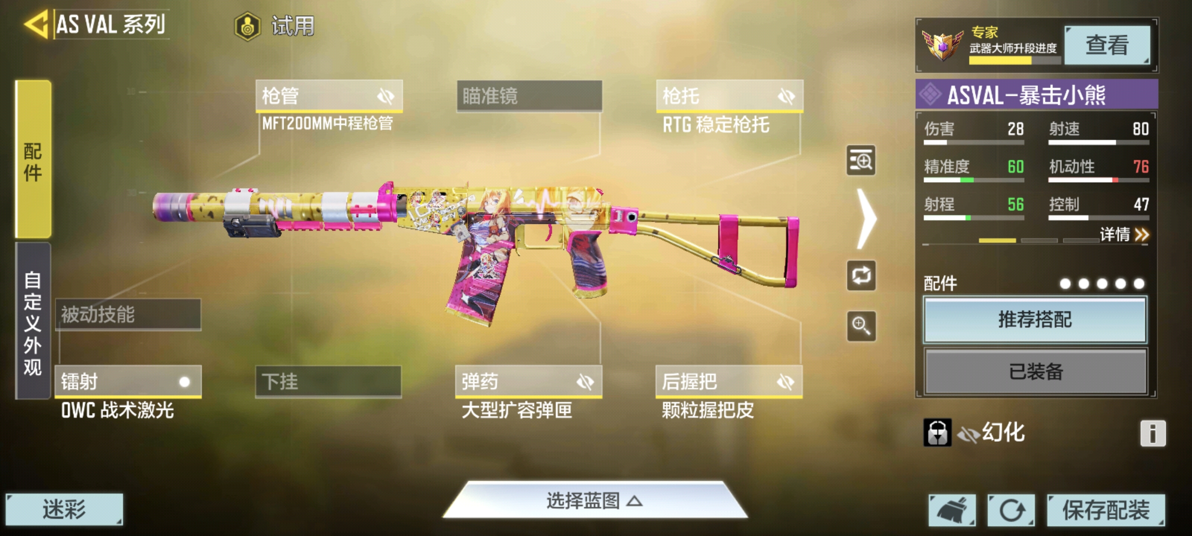 突击枪托,战术前握把A(架点可以换特战兵握把)和金属被甲弹能有效降低不利因素提高对枪胜率,配件的负面影响也较小