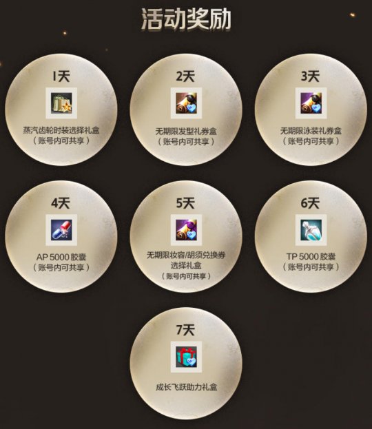 签到活动也会同步开启,每日在线满30分钟,即可获得签到奖励,其中包括S级时装蒸汽齿轮时装选择礼盒、无期限发型/泳装礼券盒、成长飞跃助力礼盒等。