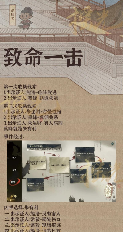 第二次收集线索:1.出示证人:朱生财-古怪性格2.出示证人:蔡峰-雇佣关系3.出示证人:朱生财-有人陪同蔡峰就是朱有利