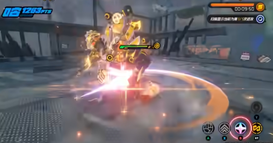 黄闪招式戳刺连段是它会后拉右手剪刀出现黄光,当黄光移动到剪尖时会打出戳刺攻击,之后会后拉右手并在剪刀上凝聚能量,当它左手往后摆动时会打出蓄力戳刺,随后抬起左手冲拳攻击角色,这个招式的三次黄闪都能被招架打断。蓄力戳刺连段招式的起手和戳刺连段中的蓄力戳刺相同,但只要这招之前没有衔接小戳刺,后面必定衔接砸拳,然后凶魁愚者会后跳远离角色并衔接一发飞刀攻击。