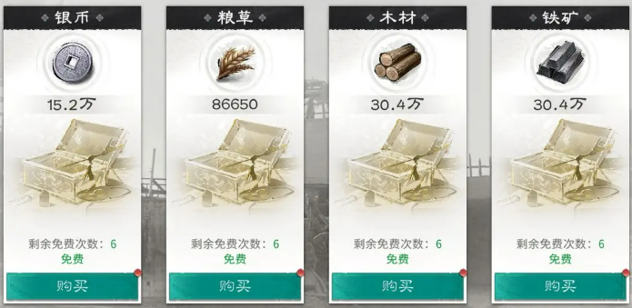 辎重站每天都会给玩家提供免费的资源领取机会,这个机会不用白不用。进入国家界面就能找到辎重站的位置,点进去之后会看到几种不同的资源可以选择。粮草、木材、铁矿、银币这些基础资源都有,玩家可以根据自己当前最缺的资源来选择领取。