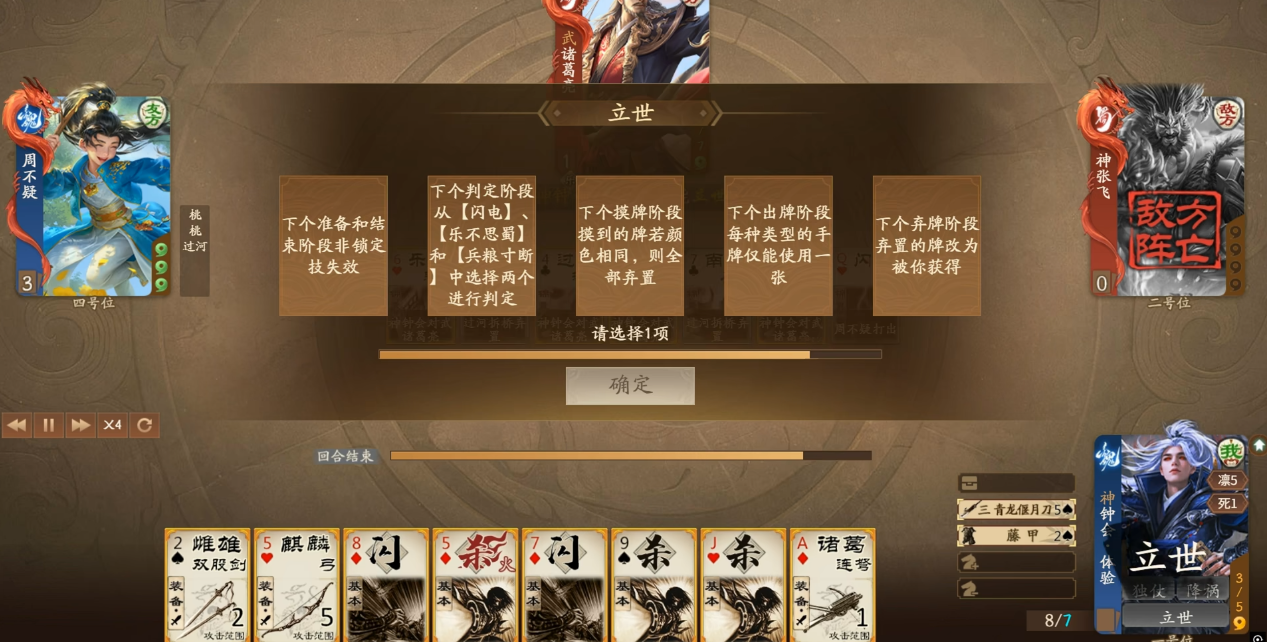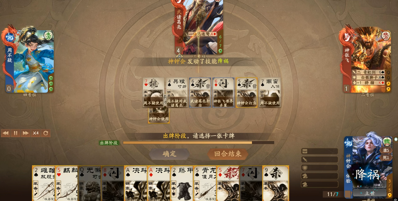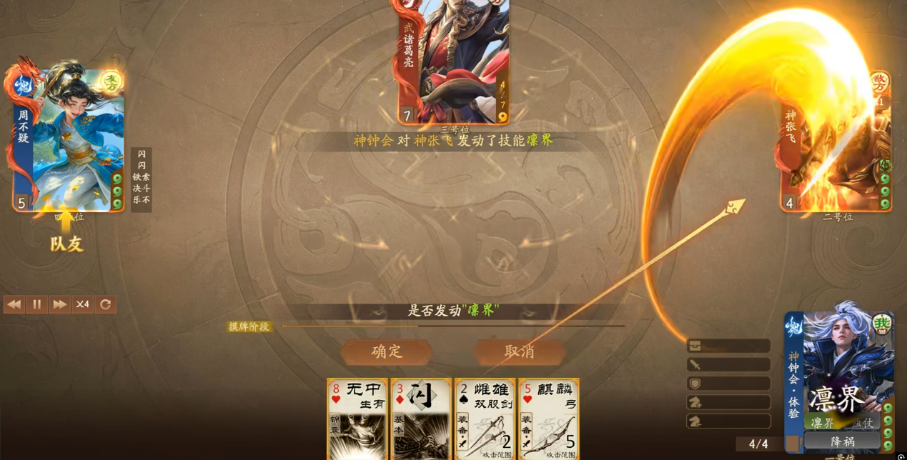 这个技能可以说是控场技能的集大成者,要理解这是一个对其它所有角色实行的效果。而其中任何一个效果,基本就等同于兵粮寸断或者乐不思蜀的收益了。更何况正常情况下是要触发其中的复数效果的,也就是说神钟会一旦觉醒,那场上其它的所有角色就很有可能又没牌又出不了牌。不过这套技能组有一个硬伤,那就是没有过牌。神钟会的所有收益基本上都压在了觉醒之后,但如果把视线聚焦在觉醒之前,就会发现它是一个既没有过牌也没有防御的小脆皮。下限发挥很有可能就是每轮打一点直伤,如果被人揍了,甚至很有可能直接暴毙。