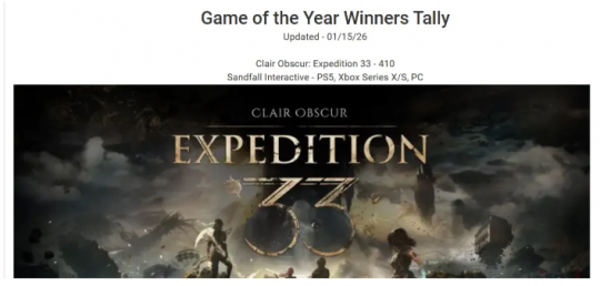 根据ResetEra论坛用户整理的更新数据,截至2026年初,《光与影:33号远征队》在本年度已累计获得410个年度游戏”奖项。这一成绩使其超越了获得326个奖项的《最后的生还者 第二部》,跃居历史排行榜第二位。
