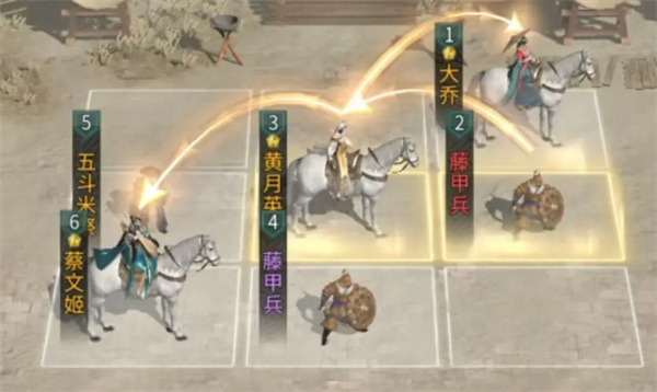 由于黄月英需要踩蔡文姬和大乔的追击格,因此大乔只能放置在前排,同时在黄月英和蔡文姬的前方各放置1个藤甲兵或陷阵营来承担伤害,后排可补充一个五斗米祭以提升阵容的恢复能力。