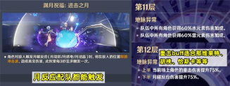 12层上半战场的地脉效果为当前场上角色的重击伤害提升75%,非常适合那维莱特、胡桃等以重击为主要输出手段的角色。下半则直接提升75%的月曜反应伤害,明确鼓励玩家使用以月感电、月绽放为代表的月体系队伍进行攻略。