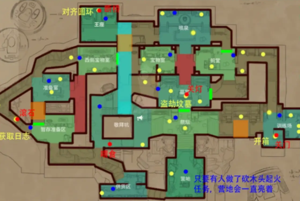 暂存准备区左上方:滚石任务:机关触发后,巨石会沿着预设路径滚动。凡是处于滚石路径上的玩家都会被直接击杀,且该击杀不会留下玩家尸体,也无法发起报告;即便路径上原本存在其他玩家的尸体,也会被滚石清除,同样无法报告。这种特性能很好地掩盖鸭阵营的击杀痕迹,避免因尸体引发好人阵营的怀疑和讨论。