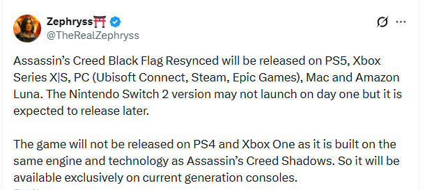 《刺客信条》舅舅@TheRealZephryss发推爆料,称《刺客信条4:黑旗 重制版》将登陆PC(Ubisoft Connect、Steam、Epic Games),PS5,Xbox Series X|S,Mac和亚马逊云游戏平台Luna。该作首发不会登陆Switch 2,但之后会移植到Switch 2。