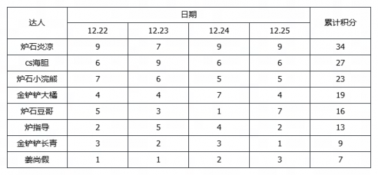 品鉴会分为两个阶段,为期四天的积分赛段和最终决赛。在积分赛阶段(12月22?25日),8位达人化身”大棋品鉴官,通过BO1赛制激烈争夺积分。这期间品鉴官们都展示出了惊人的风采,无论是堪称黑科技”的阵容速成绝技,还是稳扎稳打的大后期运营思路,皆在无界棋盘上交相辉映。经过四天的鏖战,对局积分最高、表现最为稳健的四位选手——炉石炎凉、CS海胆、炉石小浣熊、金铲铲大橘脱颖而出,成功锁定决赛席位。