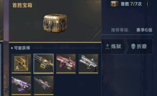 通过以上模式的首胜困难本可以获得七个金色首胜宝箱,这个箱子有大概率直接开除金色或紫色的整枪以及金色武器碎片。