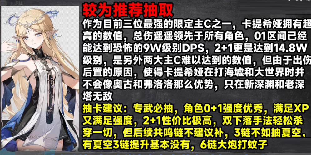 可抽人群:XP党玩家(角色设计戳中喜好);计划长期深耕,愿意等待新深渊模式的玩家。新玩家抽卡需同步抽取下空(卡缇西亚最佳辅助),老玩家无需纠结,基本都会补齐。