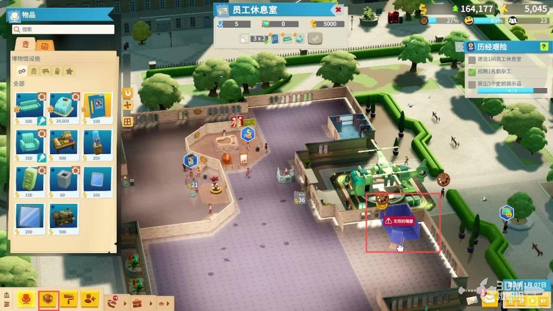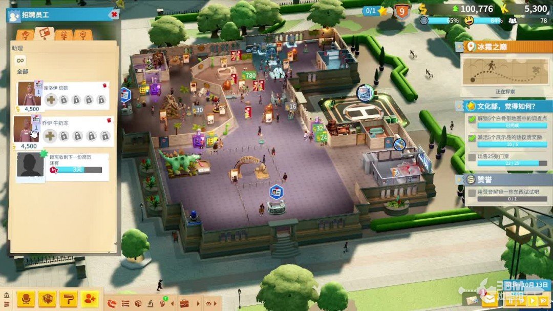 在游戏的一开始推荐玩家先从剧情模式开始游玩,剧情模式下有详细的指引相当于一个新手教程。刚开始玩家会接受到一个空白的博物馆,玩家需要招收员工、布置展览品提升博物馆的热议度吸引游客过来参观。